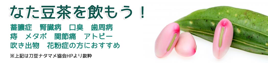 とくに健康茶としてなた豆茶は有名で、「悪い膿を出す」ということで腎臓、口臭、痔、蓄膿症、副鼻腔炎、便秘などの方に愛用されてきました。